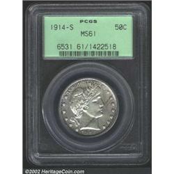 1914-S 50C MS61 PCGS. The borders and devices are lightly outlined with charcoal patina. A nicely struck Half Dollar that has modest luster. The surfaces are well preserved for the grade. Less than 1 million pieces were struck, and Uncirculated survivors are surprisingly elusive.From the Ohio Collection. Important notice: We expect to be auctioning lots at the rate of 200-250 per hour. Sometimes eBay Premier live bid software cannot keep up with that pace, so we strongly recommend that you place a realistic proxy bid now as insurance to avoid disappointment. Also please note that all Heritage/CAA lots purchased through eBay Premier carry a 20% Buyer's Premium. Please make sure you read the Terms and Conditions.