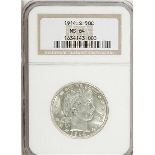 <B>1914-S 50C MS64 NGC.</B></I> This shimmering near-Gem piece certainly appears to be a lot of coin for the grade, as it is perhaps only a straight, small scrape on Liberty's cheek that keeps it from the Gem category. The strike is well executed, the silver-gold surfaces boast delightful cartwheel luster, and the fields are exceptionally smooth on each side, with some prooflikeness on the reverse. Census: 33 in 64, 12 finer (1/08).<BR><I>From The Southwest Collection.</B></I><BR><BR><B>Coin Engraver:</B> Charles E. Barber<BR><BR><b>Shipping:</b> Coins & Currency (<a target="_blank" href="http://www.heritageauctions.com/common/shipping.php">view shipping information</a>)