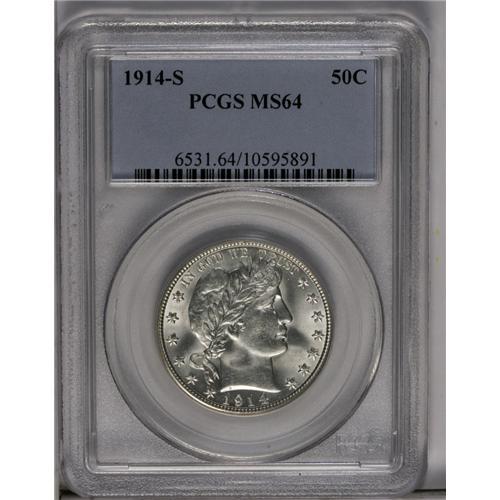 <B>1914-S<50C> MS64 PCGS.</B></I> This is a surprisingly scarce date, overshadowed by the rare Philadelphia Mint issue of the same year. Only 992,000 examples were struck in San Francisco, and few have survived at the MS64 grade level, and even fewer in finer grades. Both sides are fully struck and highly lustrous with brilliant satiny silver surfaces. Population: 26 in 64, 15 finer (5/06).