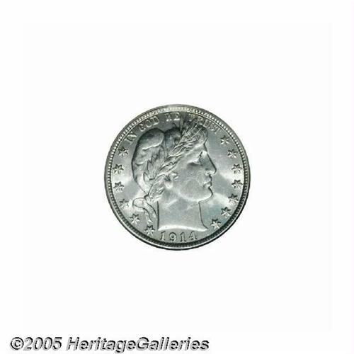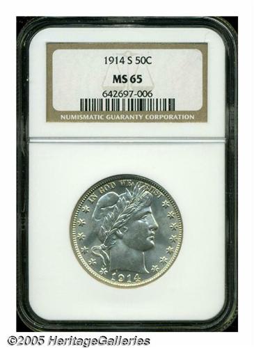 <B>1914-S<50C> MS65 NGC.</B></I> The 1914-S is almost as scarce as the 1913-S in Gem condition even though 50% more coins were struck of the '14-S. The 1914-S is one of the occasional issues whose true rarity may be overshadowed by its close chronological proximity to a major rarity, in this case the 1914-P. This particular piece is mostly brilliant with rich, thick mint frost that swirls around each side. Sharply struck throughout. Population: 9 in 65, 3 finer (6/05).