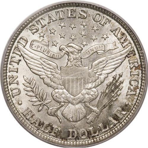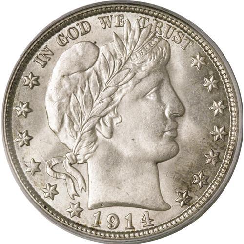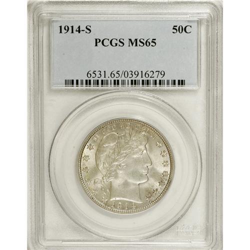 <B>1914-S 50C MS65 PCGS.</B></I> This is a lovely piece that has smooth, virtually unblemished surfaces (just a few tiny marks are seen on Liberty's face). The striking details are impressively sharp on each side and the bright, satiny mint luster is unabated and effulgent. A slight degree of mottled lilac and russet patina enhances the peripheral regions. Despite a considerably higher mintage, the 1914-S is scarcer than the 1913-S in Gem condition. Population: 12 in 65, 4 finer (3/07).<BR><BR><b>Shipping:</b> Coins & Currency (<a target="_blank" href="http://www.heritageauctions.com/common/shipping.php">view shipping information</a>)
