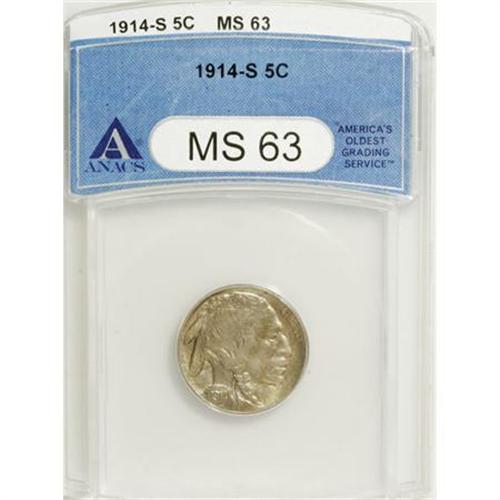 <B>1914-S 5C MS63 ANACS.</B></I> NGC Census: (228/398). PCGS Population (364/511). Mintage: 3,470,000. Numismedia Wsl. Price for NGC/PCGS coin in MS63: $340. (#3926)<BR><BR><B>Coin Engraver:</B> James E. Fraser<BR><BR><b>Shipping:</b> Coins & Currency (<a target="_blank" href="http://www.heritageauctions.com/common/shipping.php">view shipping information</a>)