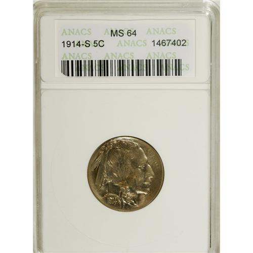 <B>1914-S 5C MS64 ANACS.</B></I> NGC Census: (323/70). PCGS Population (358/126). Mintage: 3,470,000. Numismedia Wsl. Price: $530. (#3926)<BR><BR><b>Shipping:</b> Coins & Currency (<a target="_blank" href="http://www.heritageauctions.com/common/shipping.php">view shipping information</a>)