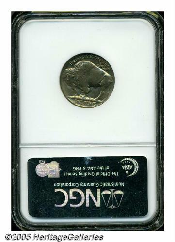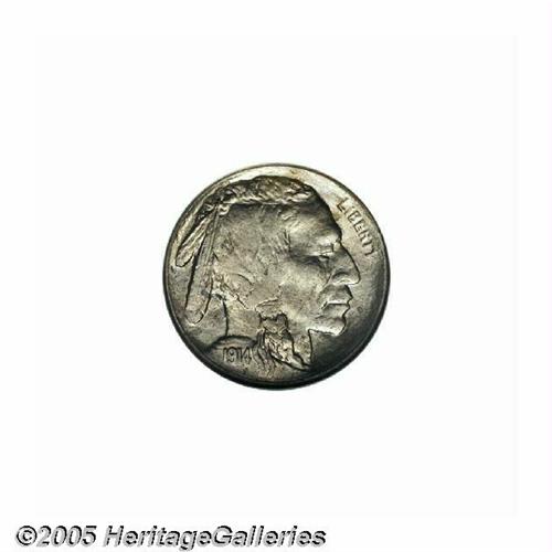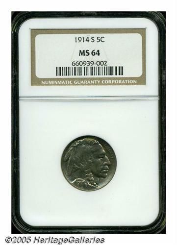 <B>1914-S<5C> MS64 NGC.</B></I> A sharply struck horn and excellent detail to the tip of the tail give this nice Buffalo nickel excellent appeal. Lustrous surfaces display a nearly imperceptible veneer of ice-blue and champagne patina, overrun by numerous freckles of charcoal-gray. No significant contact marks are apparent. NGC has certified 58 coins finer (6/05).