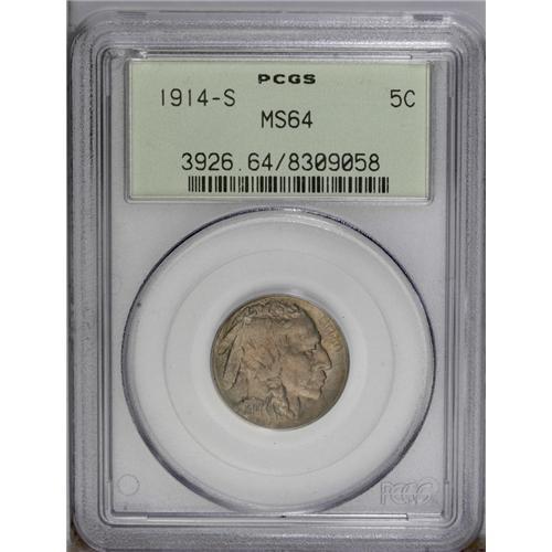 <B>1914-S<5C> MS64 PCGS.</B></I> Lustrous deep gray surfaces exhibit darker gray-brown color with iridescent highlights. <BR><BR><B>Important notice:</B> Heritage usually auctions material at the rate of 200-250 lots per hour. On some occasions eBay Live bid software or the Internet may not be able to keep up with the pace of the auction. We recommend placing a realistic absentee bid now as insurance to avoid disappointment. Occasionally the auctioneer may eliminate or reject an eBay Live bid, and the auctioneer may also reopen a lot after the close of the eBay live bidding (usually because we missed an audience bid), and may reject your bid even if it shows you as the winning bidder. By bidding via eBay Live, you agree that Heritage may award the lot to another bidder at its sole discretion under the circumstances described above or any other reasonable circumstances. Since eBay bids are not shown to us until we open the lot on the floor, we treat those bids just like floor bids. In most cases the floor responds before the eBay bid is presented to us, due to Internet lag time, so for consistency we have made it a policy that floor bids are always considered first over tie eBay live bids. Also please note that all Heritage lots purchased through eBay Live carry a 20% Buyer's Premium. Please make sure you read the Terms and Conditions before you bid. This lot is being auctioned in conjunction with a live floor auction by Heritage Galleries & Auctioneers. All final auction and invoice information will be supplied by Heritage Galleries & Auctioneers, and all other information should be considered preliminary. Lot:1042 <BR><BR><B>Winning Notification and Billing:</B> After the FINAL session in this auction is complete, Heritage will send e-mail and snail mail invoices. This process normally takes several days. All final auction and invoice information will be supplied by Heritage Galleries & Auctioneers, and all other information should be considered preliminary. <BR><BR>This auction will be conducted on a live auction floor and over the Internet through eBay Live. If you choose to place an absentee bid, please take a moment to <font color='#0000ff'><u><a href='http://pages.ebay.com/liveauctions/help/before/laabsentee.html'>learn how eBay Live absentee bidding works</a></u></font><font color='#000000'>