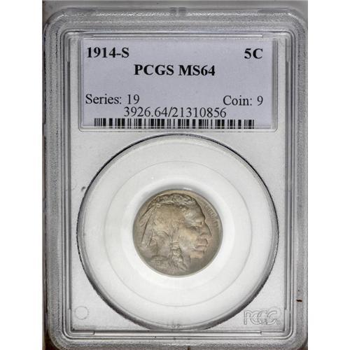 <B>1914-S<5C> MS64 PCGS.</B></I> Lustrous surfaces display a thin veneer of iridescent powder-blue, orange-gold, and lilac patination. The design features are well brought up, and the surfaces are well preserved. A couple of tiny planchet flakes are noted at the rim above the R in LIBERTY. <BR><BR><B>Important notice:</B> Heritage usually auctions material at the rate of 200-250 lots per hour. On some occasions eBay Live bid software or the Internet may not be able to keep up with the pace of the auction. We recommend placing a realistic absentee bid now as insurance to avoid disappointment. Occasionally the auctioneer may eliminate or reject an eBay Live bid, and the auctioneer may also reopen a lot after the close of the eBay live bidding (usually because we missed an audience bid), and may reject your bid even if it shows you as the winning bidder. By bidding via eBay Live, you agree that Heritage may award the lot to another bidder at its sole discretion under the circumstances described above or any other reasonable circumstances. Since eBay bids are not shown to us until we open the lot on the floor, we treat those bids just like floor bids. In most cases the floor responds before the eBay bid is presented to us, due to Internet lag time, so for consistency we have made it a policy that floor bids are always considered first over tie eBay live bids. Also please note that all Heritage lots purchased through eBay Live carry a 20% Buyer's Premium. Please make sure you read the Terms and Conditions before you bid. This lot is being auctioned in conjunction with a live floor auction by Heritage Galleries & Auctioneers. All final auction and invoice information will be supplied by Heritage Galleries & Auctioneers, and all other information should be considered preliminary. Lot:1043 <BR><BR><B>Winning Notification and Billing:</B> After the FINAL session in this auction is complete, Heritage will send e-mail and snail mail invoices. This process normally takes several days. All final auction and invoice information will be supplied by Heritage Galleries & Auctioneers, and all other information should be considered preliminary. <BR><BR>This auction will be conducted on a live auction floor and over the Internet through eBay Live. If you choose to place an absentee bid, please take a moment to <font color='#0000ff'><u><a href='http://pages.ebay.com/liveauctions/help/before/laabsentee.html'>learn how eBay Live absentee bidding works</a></u></font><font color='#000000'>