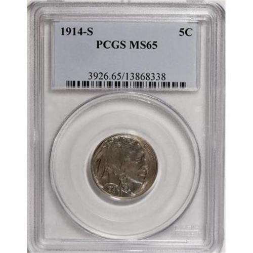 <B>1914-S 5C MS65 PCGS.</B></I> Rich and satiny luster is noted on both sides of this luscious Gem, with a pleasant pastel overlay of pink and baby-blue over dominantly silver-gray surfaces. Nicely struck for the issue with clean surfaces that show very few marks and an absence of the carbon flyspecks that are so often seen.<BR><BR><B>Coin Engraver:</B> James E. Fraser<BR><BR><b>Shipping:</b> Coins & Currency (<a target="_blank" href="http://www.heritageauctions.com/common/shipping.php">view shipping information</a>)