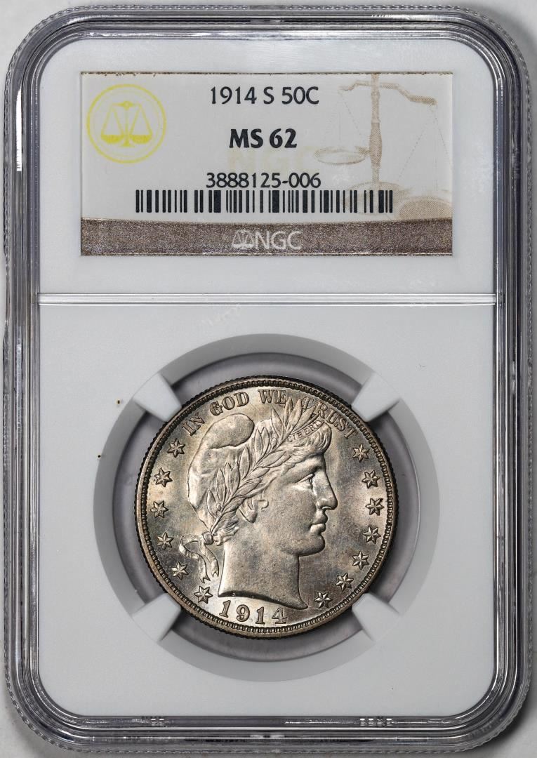 One 1914-S Barber Half Dollar Coin NGC MS62. NGC Certified.