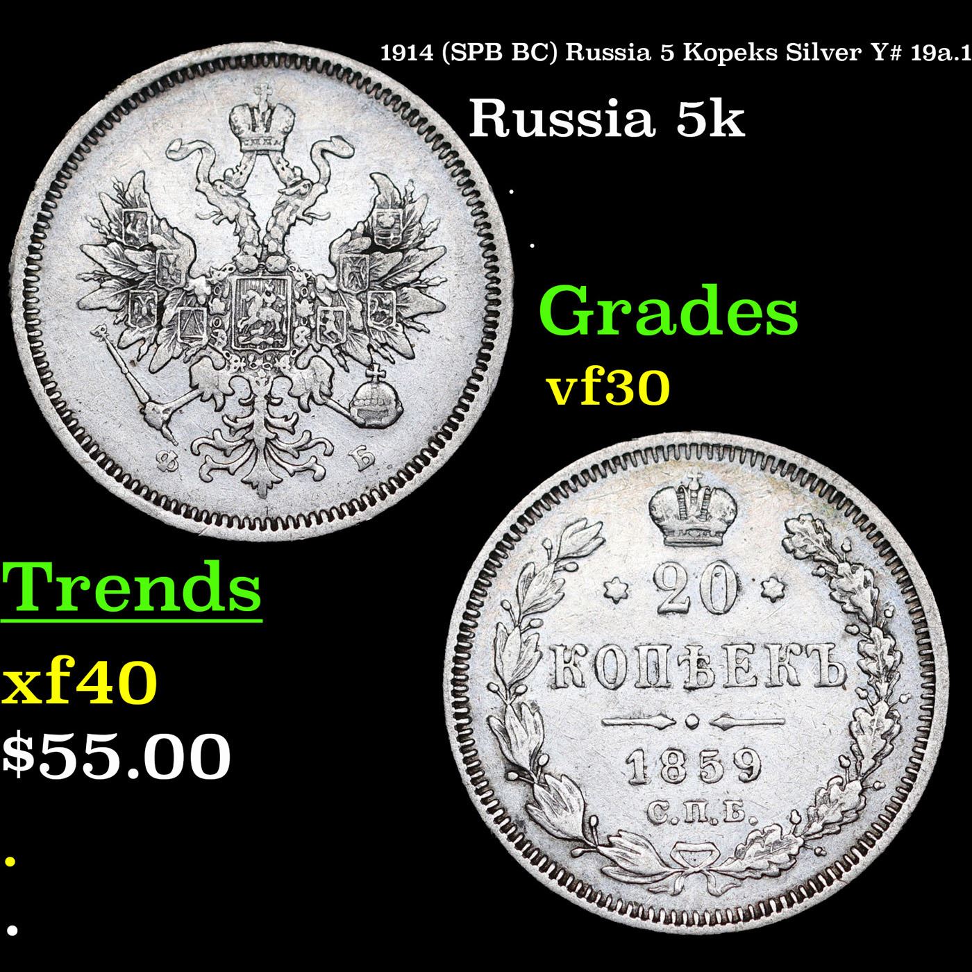 1914 (SPB BC) Russia 5 Kopeks Silver Y# 19a.1 Grades vf++.