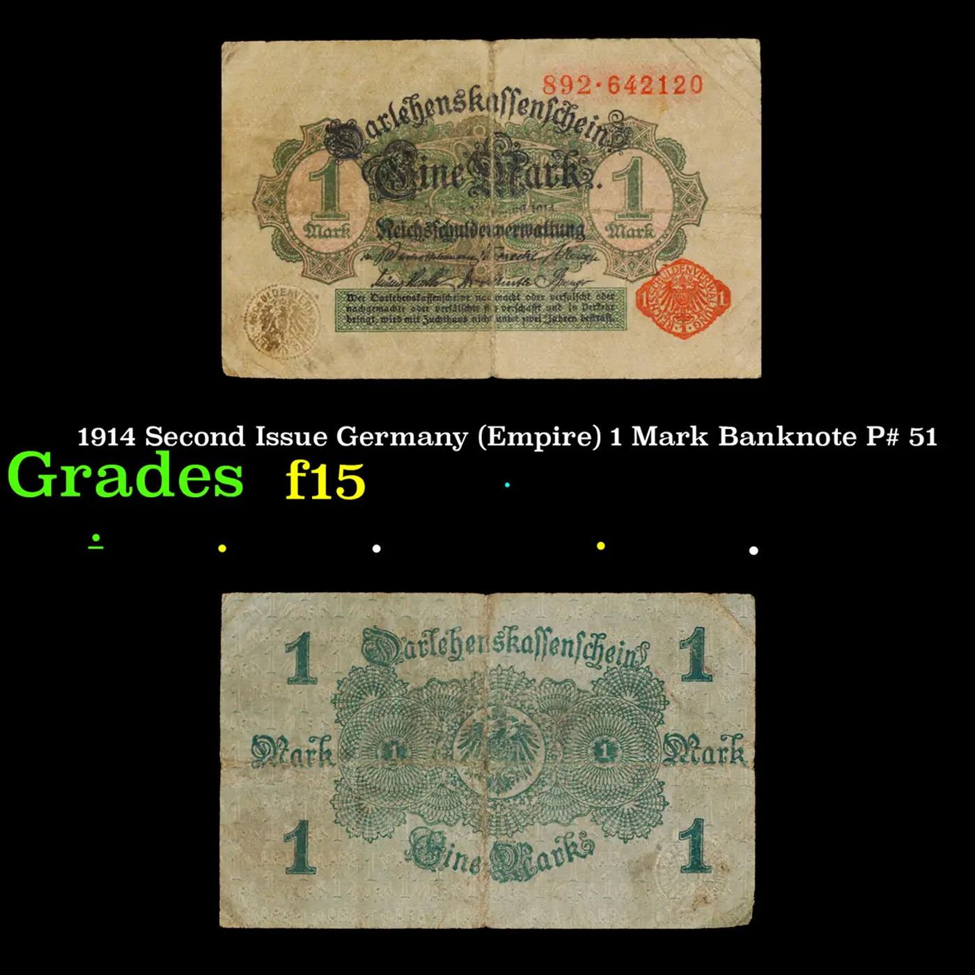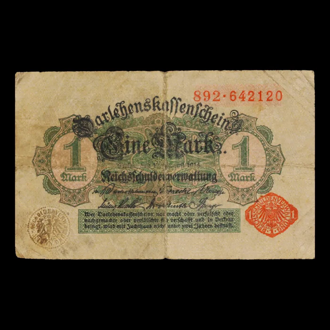 1914 Second Issue Germany (Empire) 1 Mark Banknote P# 51 Grades f+. In August 1914, Directly after the onset of WW1, the German Empire removed the gold backing of the mark and issued new currency. After the fall of the German Empire in 1918, the newly formed German Weimar Republic issued another new currency, known derisively as the "Paper Mark", which faced massive hyperinflation.