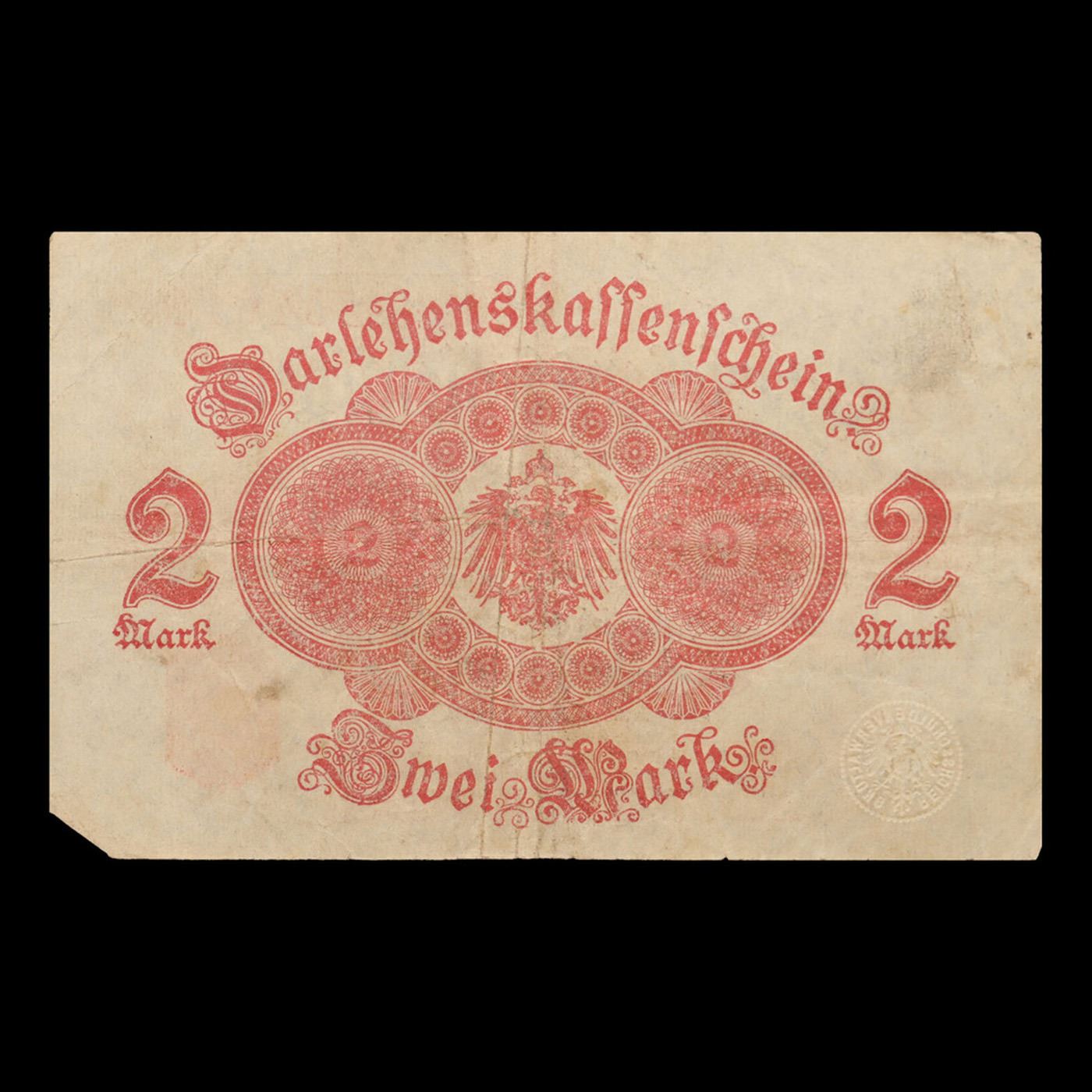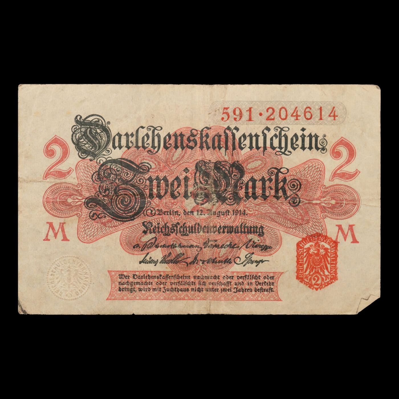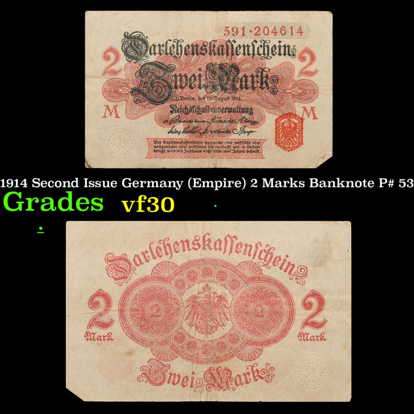 1914 Second Issue Germany (Empire) 2 Marks Banknote P# 53 Grades vf++. From 1871 to 1914 the German Mark was known as the "Goldmark", as it was on the gold standard. During WWI, like most nations, Germany removed the gold backing and ceased circulation of gold coins. The Goldmark was the culmination of years of effort put into unifying the currency of Germany.