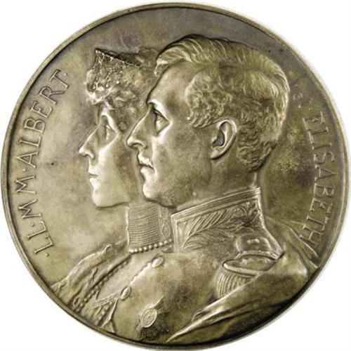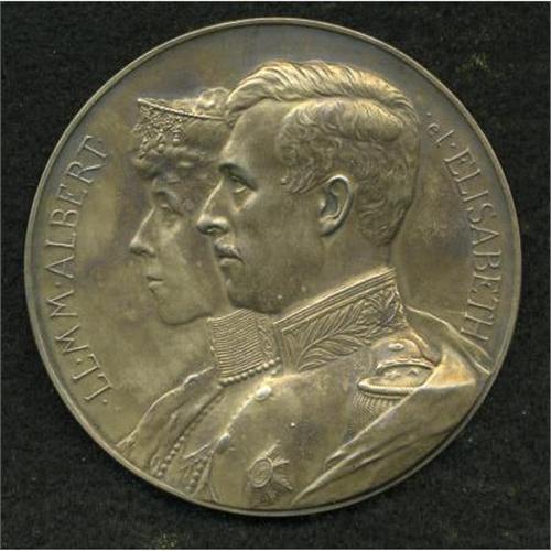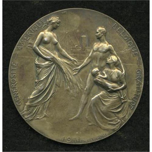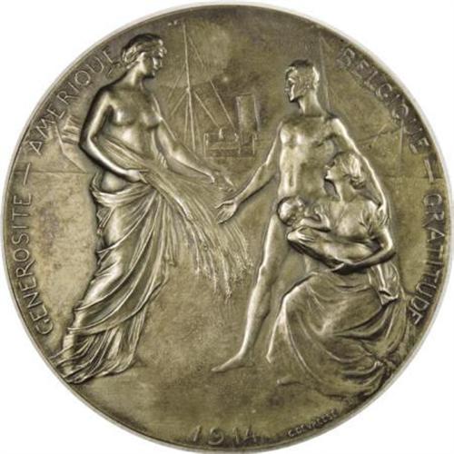 <B>1914 Silver-Plated Commemorative Belgian Medal.</B></I> Silver-plated bronze, 70 mm, 117.4 gm. Designed by C. De Vreese and made in Brussels in 1915, commemorating American aid given to the Belgian people. The obverse features the conjoined bust of King Albert and his wife Elizabeth. The reverse features a woman representing America hold wheat in her hands on the left and on the right a Belgian family receiving it. With the original cardboard box of issue<BR><BR><b>Shipping:</b> Coins & Currency (<a target="_blank" href="http://www.heritageauctions.com/common/shipping.php">view shipping information</a>)