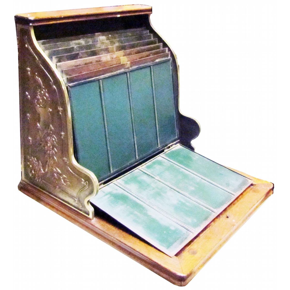 1914 Total Account System Receipt Register. Quarter sawn oak and brass. Some rust to tin panels otherwise very good original condition. 21 1/2 X 20 X 22 inches.