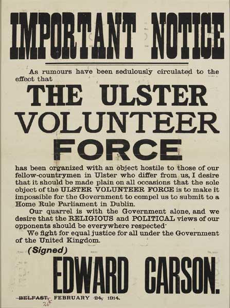 A poster titled "Important Notice" dated the 24th of February 1914 and circulated at Belfast informing people of the ideals and objectives of the Ulster Volunteer Force, written by Edward Carson.