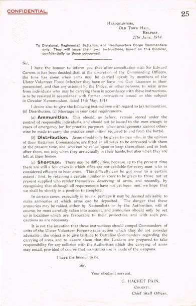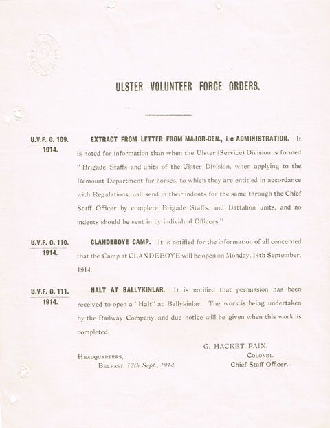 Letterpress, various sizes.A scarce collection of printed orders issued in 1914 to the Ulster Volunteer Force, including an orders relating to the formation of the 36th (Ulster) Division for service during the First World War and the carrying of arms. 12 September, 1p, General UVF orders relating to the administration of the new 'Ulster (Service) Division', Clandeboye Camp and Ballykinlar Camp. 4 July, 1p, Special orders for protection of arms during 12 July celebrations. 27 June, 1p, order from Sir Edward Carson relating to the carrying of arms openly by members with or without a license and to resist any attempt by police or others to seize them. Undated, 4pp, suggestions for Battalion supply and transport duties. (5 items)