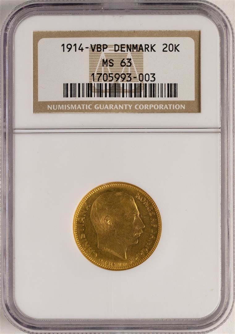 One 1914-VBP 20 Kroner Denmark Gold Coin NGC MS63. NGC Certified.