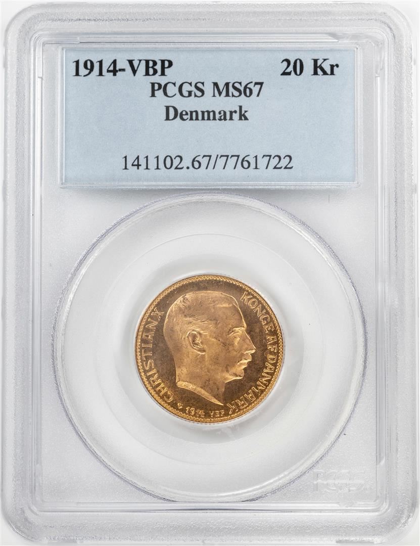 One 1914-VBP Denmark 20 Kroners Gold Coin PCGS MS67. PCGS Graded.