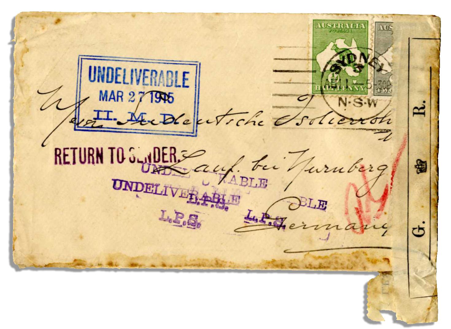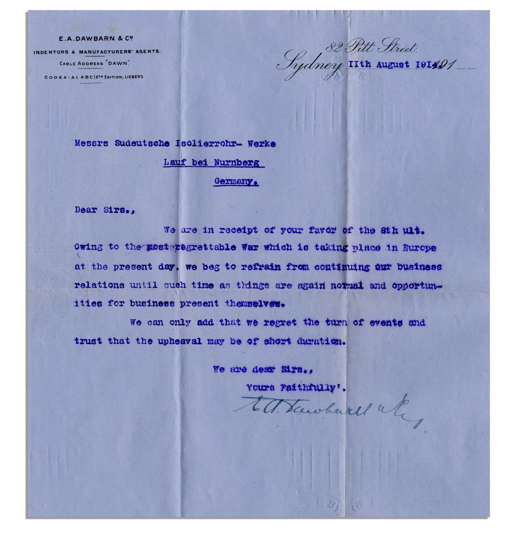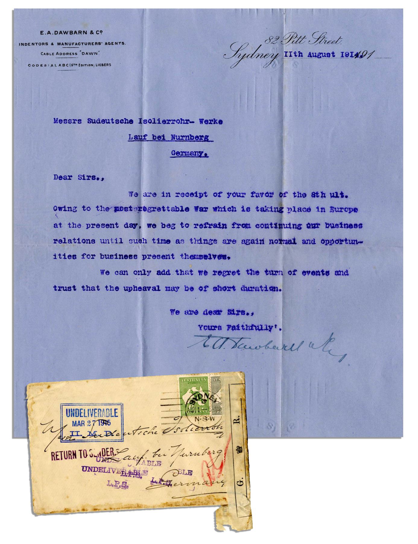 1914 undelivered postal cover and letter. An Australian manufacturing company attempts to notify a German client of a halt in business due to the war, but marks to the cover read ''Return to Sender'' and ''Undeliverable'' per the London Postal Service. A seal re-closes the cover's right edge after its opening by censors. A ''Dead Letter'' backstamp reads 11 April 1915 from Sydney. Cover measures 5.75'' x 3.5''. Dampstaining to bottom edge of cover and some toning. Typed letter measures 8.5'' x 10'', with creasing. Overall very good.
