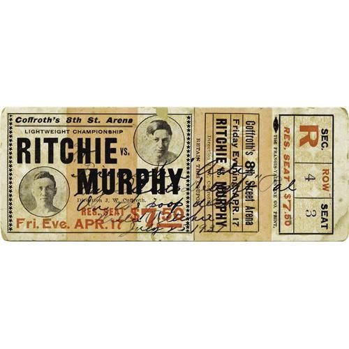 <B>1914 Willie Ritchie vs. "Harlem" Tommy Murphy Full Ticket Signed by Richie.</B></I> On April 17, 1914, World Lightweight Champion Willie Ritchie successfully defended his title, winning in a 20-round decision over "Harlem" Tommy Murphy at Coffroth's Arena in San Francisco. This is a full, unused ticket to that event which pictures both fighters and lists the section, row, and seat number. The ticket has rounded corners, some surface and edge wear, light soiling and one small stain. The stub is still firmly attached. As a bonus, this rare full ticket has been boldly inscribed and signed by Ritchie. <I>LOA from PSA/DNA.</B></I> <BR><BR><B>Important notice:</B> Heritage usually auctions material at the rate of 200-250 lots per hour. On some occasions eBay Live bid software or the Internet may not be able to keep up with the pace of the auction. We recommend placing a realistic absentee bid now as insurance to avoid disappointment. Occasionally the auctioneer may eliminate or reject an eBay Live bid, and the auctioneer may also reopen a lot after the close of the eBay live bidding (usually because we missed an audience bid), and may reject your bid even if it shows you as the winning bidder. By bidding via eBay Live, you agree that Heritage may award the lot to another bidder at its sole discretion under the circumstances described above or any other reasonable circumstances. Since eBay bids are not shown to us until we open the lot on the floor, we treat those bids just like floor bids. In most cases the floor responds before the eBay bid is presented to us, due to Internet lag time, so for consistency we have made it a policy that floor bids are always considered first over tie eBay live bids. Also please note that all Heritage lots purchased through eBay Live carry a 22.5% Buyer's Premium. Please make sure you read the Terms and Conditions before you bid. This lot is being auctioned in conjunction with a live floor auction by Heritage Galleries & Auctioneers. All final auction and invoice information will be supplied by Heritage Galleries & Auctioneers, and all other information should be considered preliminary. Lot:19144 <BR><BR><B>Winning Notification and Billing:</B> After the FINAL session in this auction is complete, Heritage will send e-mail and snail mail invoices. This process normally takes several days. All final auction and invoice information will be supplied by Heritage Galleries & Auctioneers, and all other information should be considered preliminary. <BR><BR>This auction will be conducted on a live auction floor and over the Internet through eBay Live. If you choose to place an absentee bid, please take a moment to <font color='#0000ff'><u><a href='http://pages.ebay.com/liveauctions/help/before/laabsentee.html'>learn how eBay Live absentee bidding works</a></u></font><font color='#000000'>