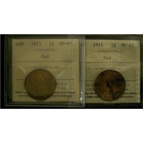 1914 and 1915 1¢, both ICCS MS-63 Red