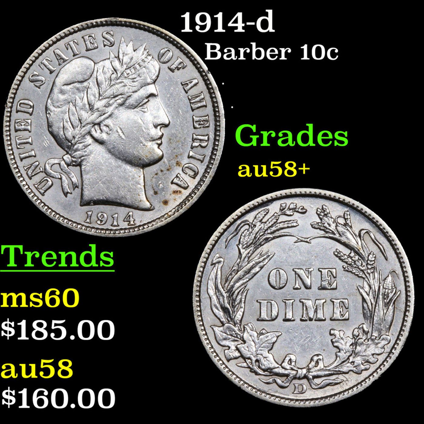 1914-d Barber Dime 10c Grades Choice AU/BU Slider+.