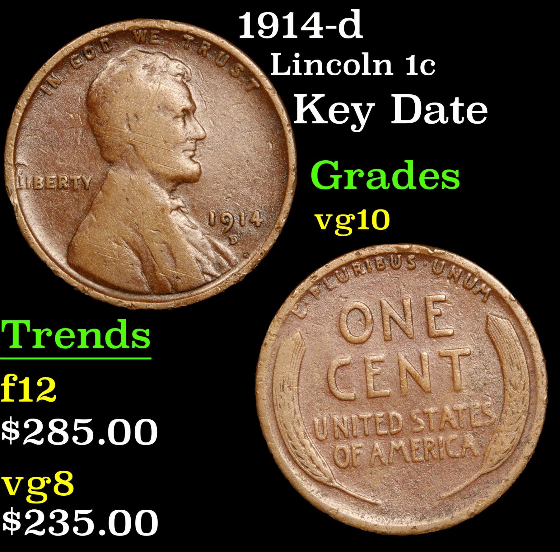 1914-d Lincoln Cent 1c Grades vg+. Key Date