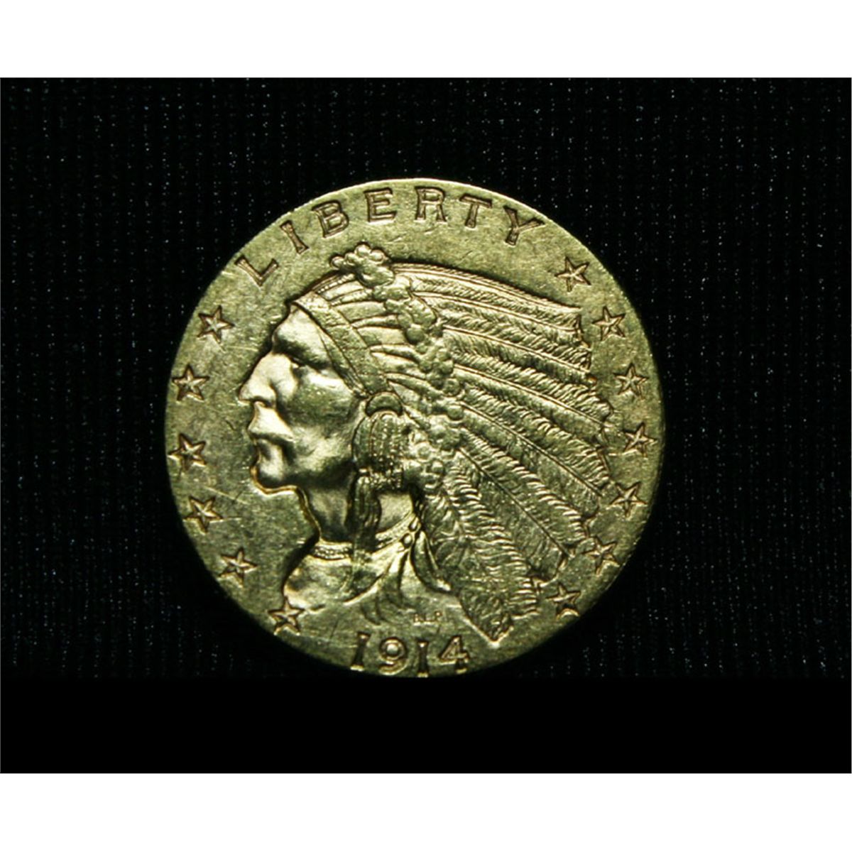 Much harder date. LOOK IT UP. Nice example, very attractive, bright coin. The $2 1/2 and $5 Indian are the first incuse designed coins since ancient times. This is a great example of the 1914-p. NGC's Price Guide lists an ms62 at $2310 and The Wholesale Greysheet lists ms62 at $1850. Estimated Value $2000