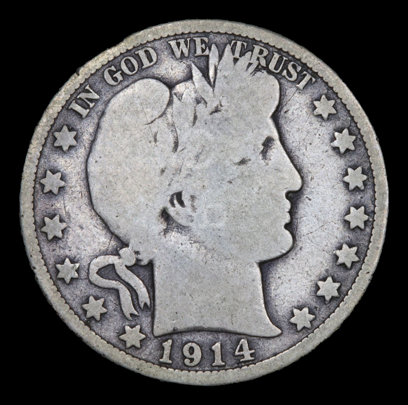 1914-p Barber Half Dollars 50c Grades vg, very good. This is a very difficult date. According to David Akers "This is a very popular date since it is the lowest mintage issue of the entire Barber Half Dollar series; only 124,230 pieces were minted."
