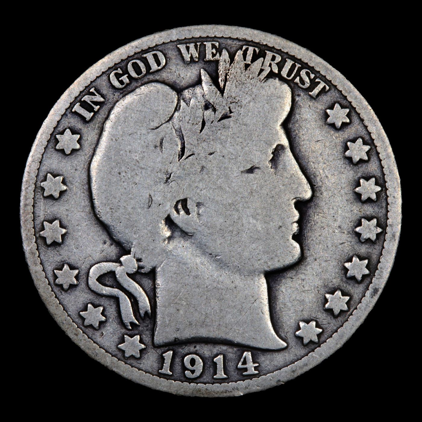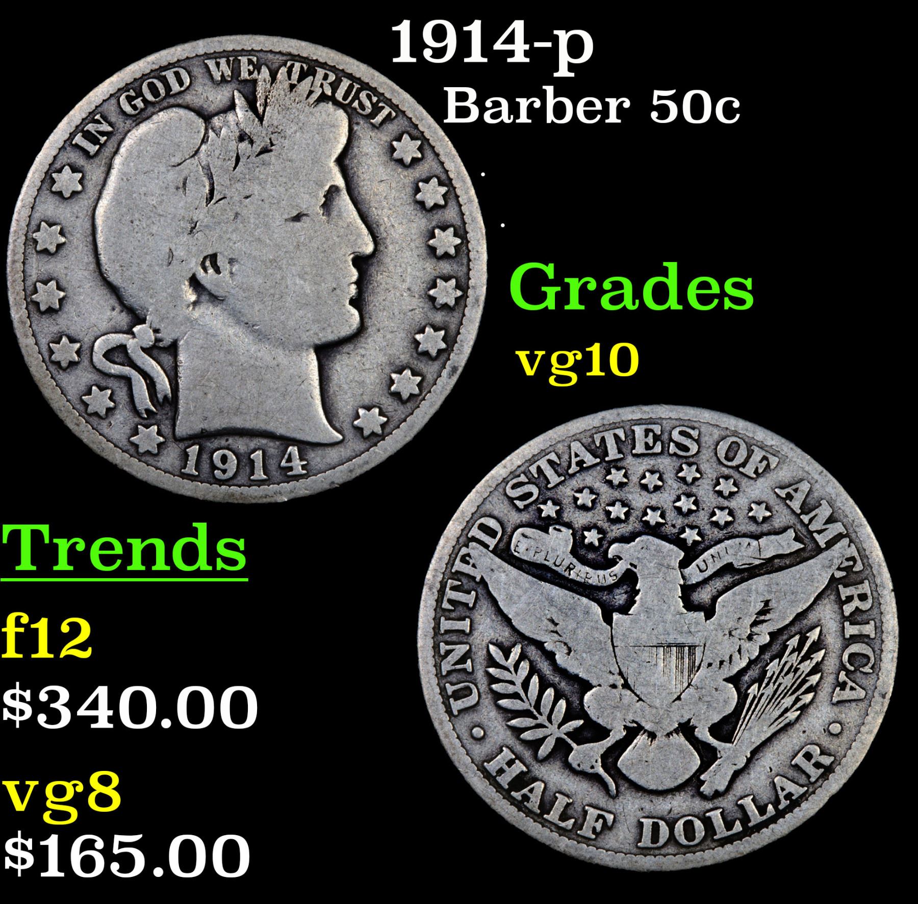 1914-p Barber Half Dollars 50c Grades vg+. This is a very difficult date. According to David Akers "This is a very popular date since it is the lowest mintage issue of the entire Barber Half Dollar series; only 124,230 pieces were minted."