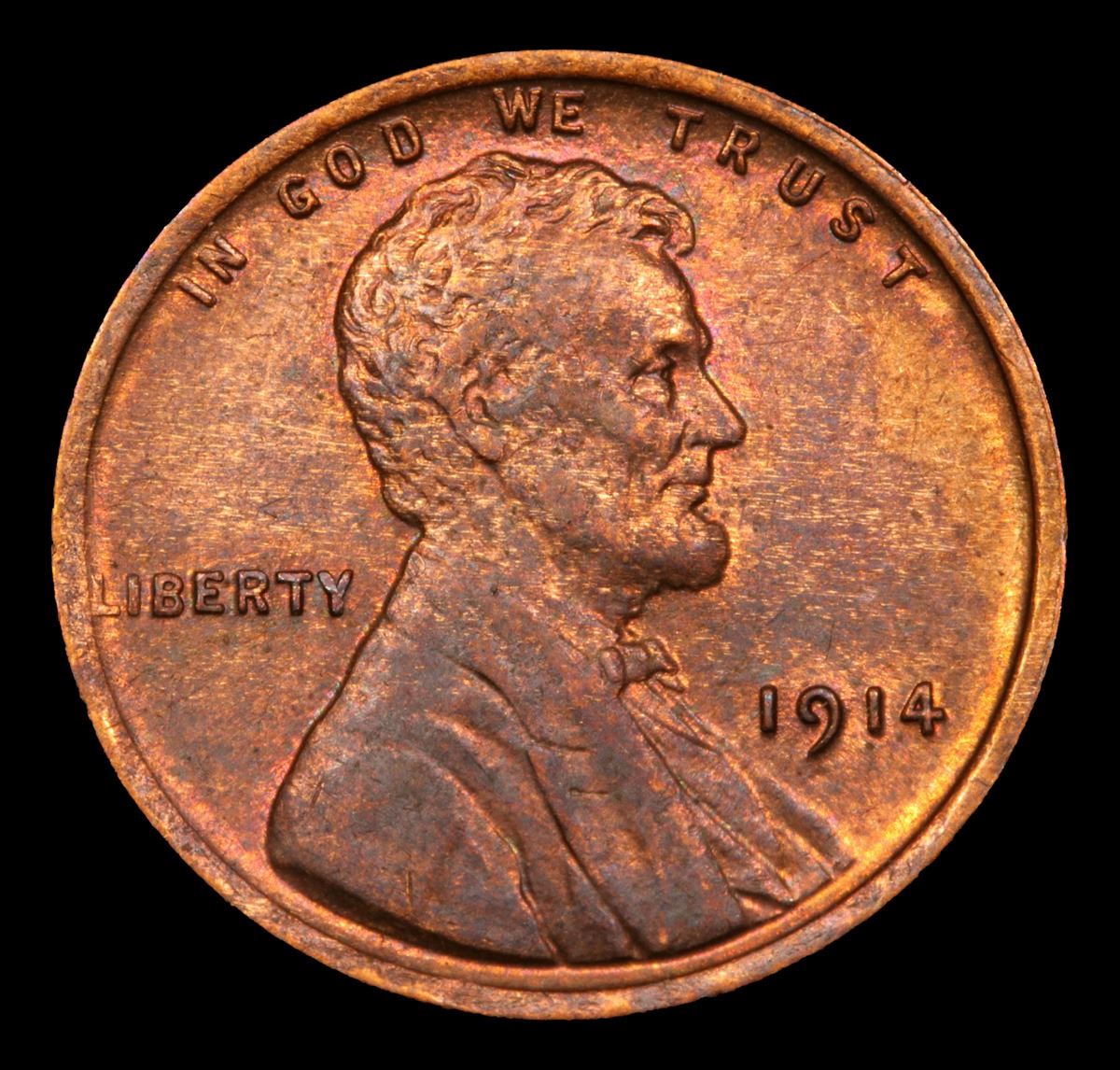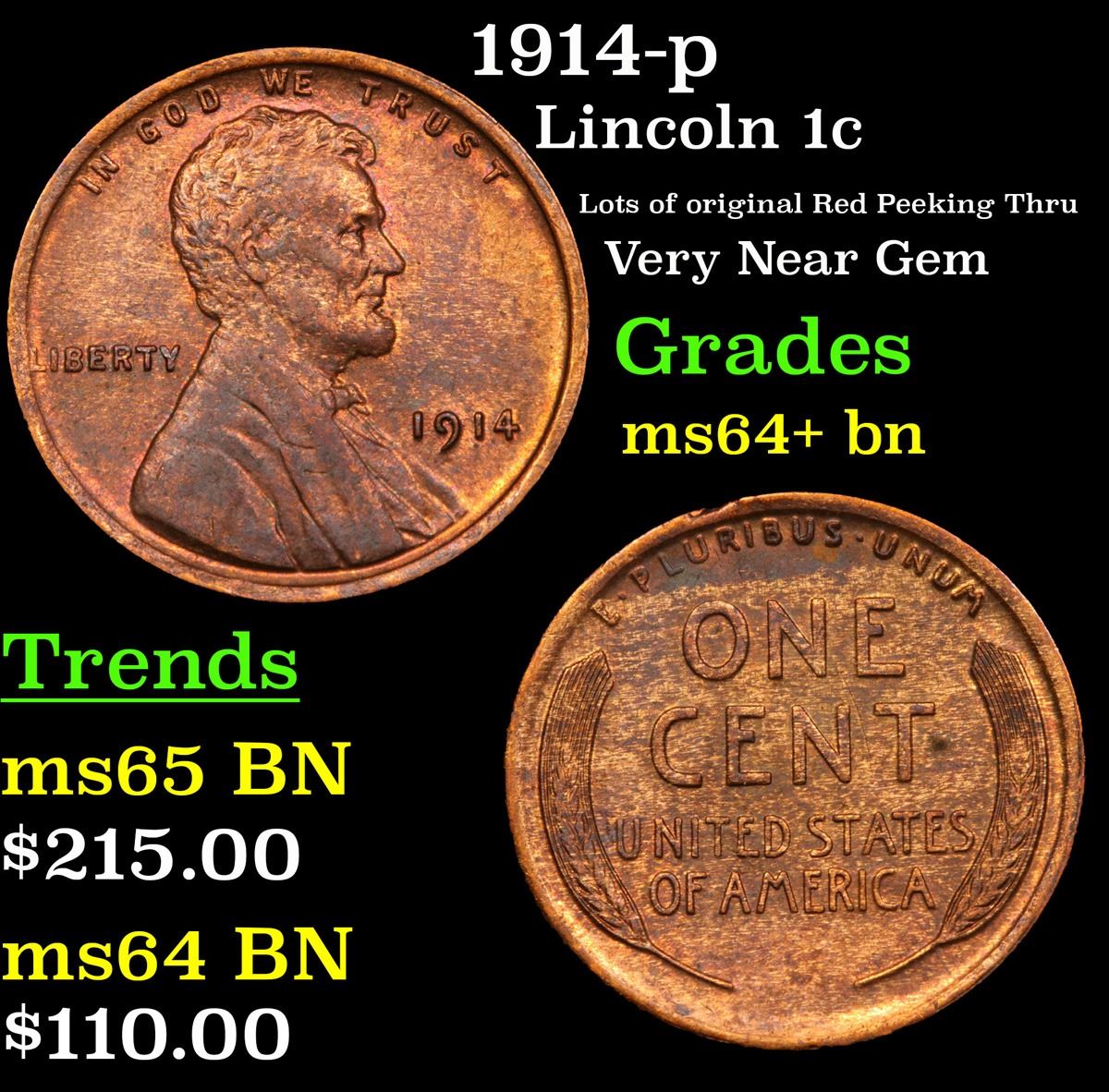 1914-p Lincoln Cent 1c Grades Choice+ Unc BN. Incredibly scarce date. Out of an original mintage of over 75 million coins struck, PCGS estimates only 600 remain in ms65 or better.