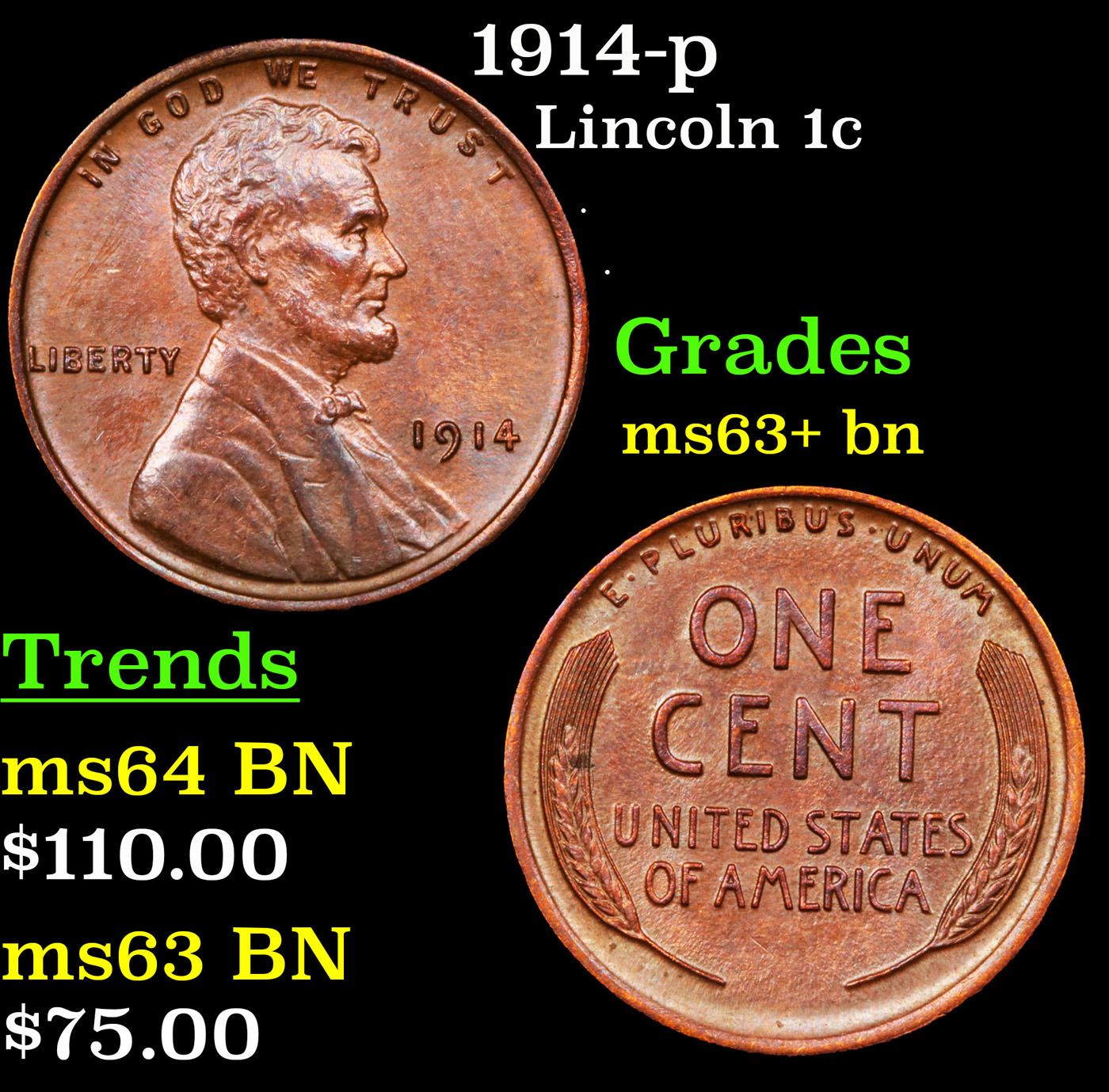 1914-p Lincoln Cent 1c Grades Select+ Unc BN. Incredibly scarce date. Out of an original mintage of over 75 million coins struck, PCGS estimates only 600 remain in ms65 or better.