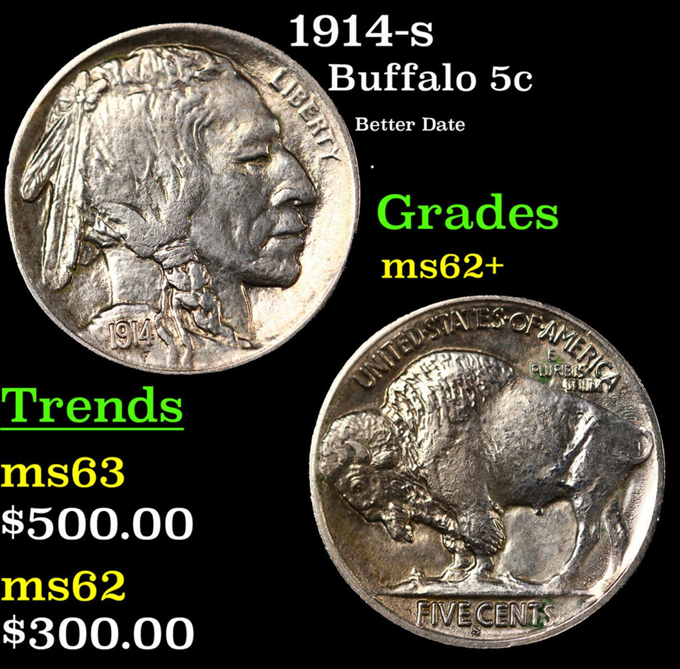 1914-s Buffalo Nickel 5c Grades Select Unc.