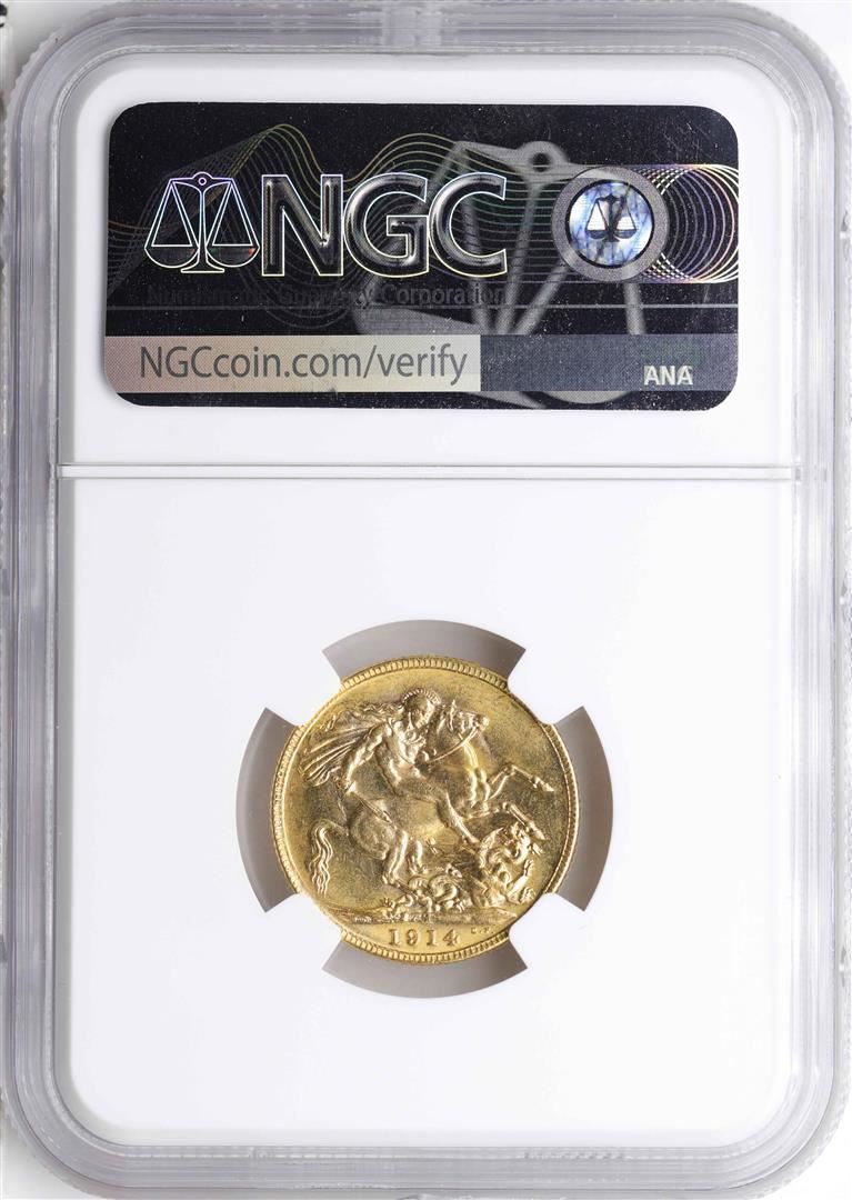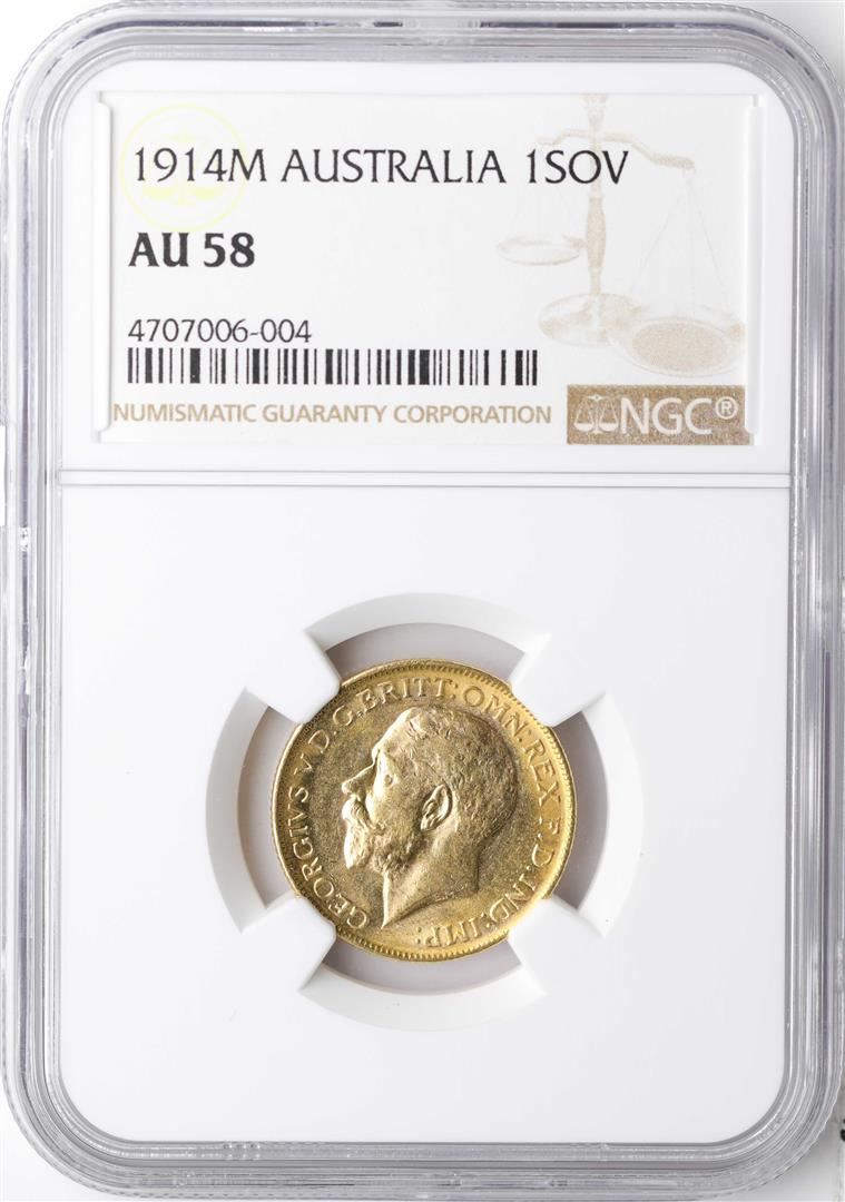 One 1914M Australia Sovereign Gold Coin NGC AU58. NGC Certified.