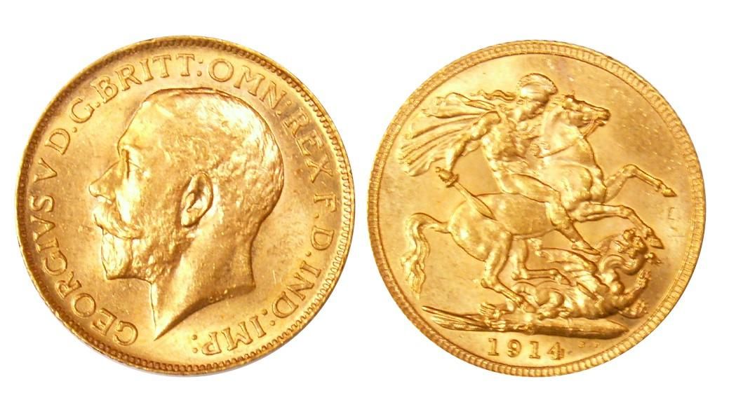 1914c Gold Sov. AU-UNC. Lots of lustre.