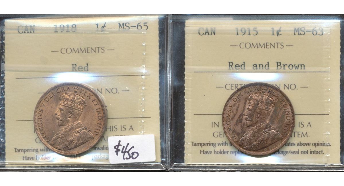 1915 1¢ ICCS MS63RB.1918 1¢ ICCS MS65RD. Lustrous 80% red.