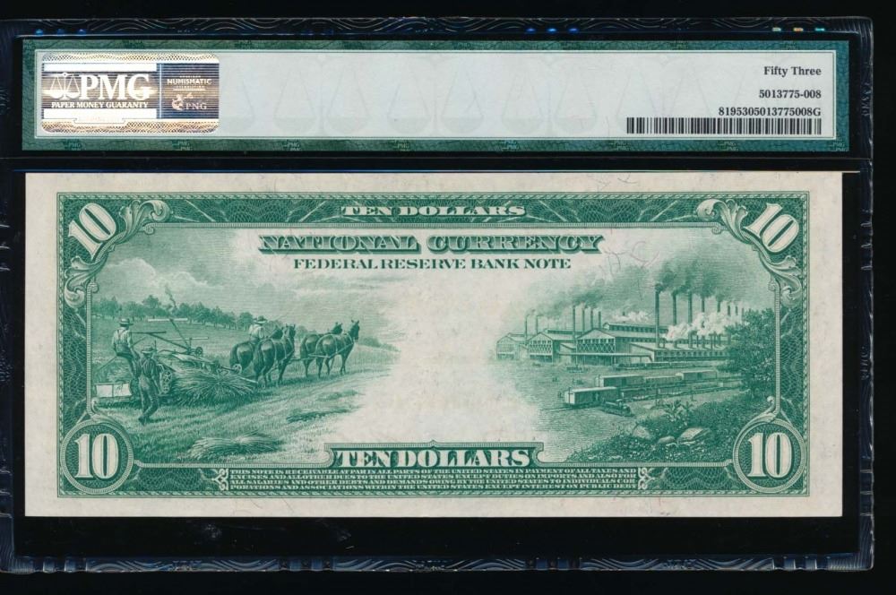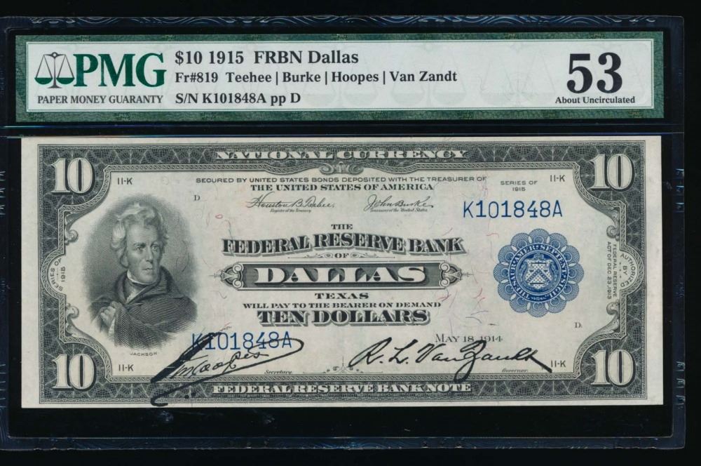 One 1915 $10 Dallas Federal Reserve Bank Note PMG 53.