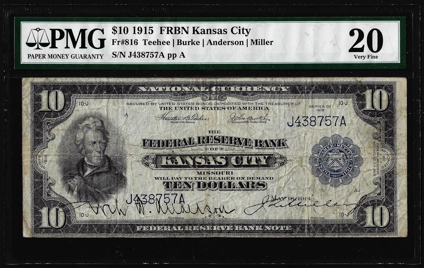 One 1915 $10 Federal Reserve Bank Note Kansas City Fr.816 PMG Very Fine 20. PMG Certified.