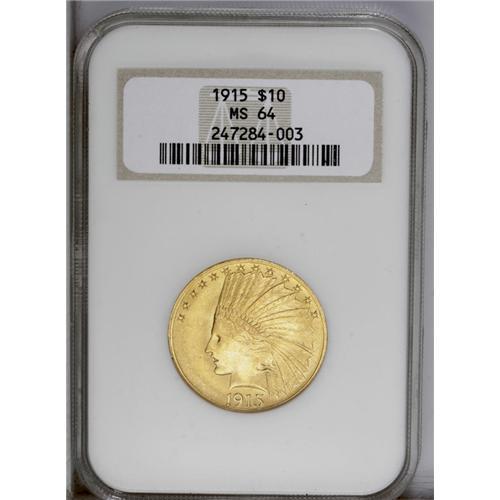 1915 $10 MS 64 NGC. The bright, lustrous orange-gold s