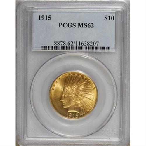 <B>1915 $10 MS62 PCGS.</B></I> The 351,000 pieces struck for this issue would be the last eagles coined at Philadelphia for more than a decade, as production would not resume there until 1926. This well struck piece has pleasing luster and lovely lemon-yellow color on both sides. Lightly abraded overall, though the visual appeal approaches that of a Select piece.<BR><BR><b>Shipping:</b> Coins & Currency (<a target="_blank" href="http://www.heritageauctions.com/common/shipping.php">view shipping information</a>)