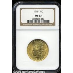 <B>1915 $10 MS63 NGC.</B></I> Lustrous surfaces display sharply struck design elements, and attractive peach-gold patination. A few light grade-defining marks are seen on the Indian's cheek.