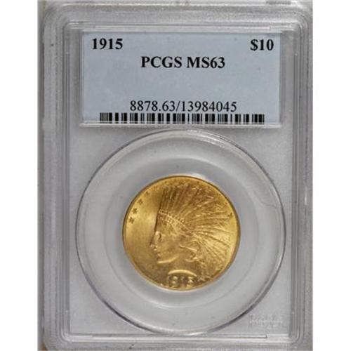 <B>1915 $10 MS63 PCGS.</B></I> A pleasing canary-gold example of this final pre-war Philadelphia issue. Luster dominates the generally smooth surfaces. The obverse is particularly attractive.<BR><BR><B>Coin Engraver:</B> Augustus Saint-Gaudens<BR><BR><b>Shipping:</b> Coins & Currency (<a target="_blank" href="http://www.heritageauctions.com/common/shipping.php">view shipping information</a>)