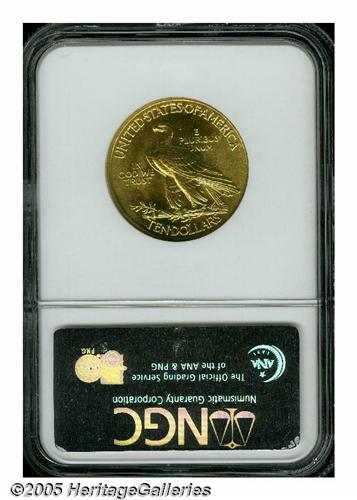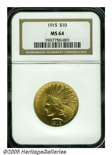 <B>1915<$10> MS64 NGC.</B></I> A sharply detailed near-Gem with matte-like surfaces with bright golden patina. A couple of small contact marks on the cheek, prevent an even higher grade assessment.
