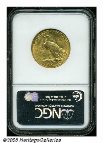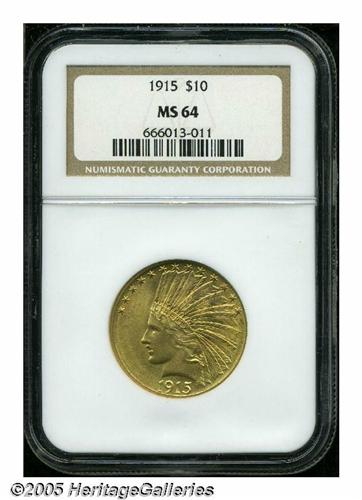 <B>1915<$10> MS64 NGC.</B></I> Lustrous, peach-gold surfaces display a matte-like appearance and sharply struck motifs. The grade is defined by a few minute marks on the Indian's cheek. NGC has seen 79 pieces finer (5/05).