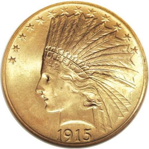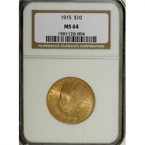<B>1915 $10 MS64 NGC.</B></I> Jeff Garrett and Ron Guth (2006) say of the 1915 ten dollar that "... this date stands out as one of the finer examples of this design to come off the dies." The near-Gem in this lot is in concert with the authors' assertion. Its yellow-gold surfaces yield pleasing luster, and offer sharply struck design elements. An alloy spot is visible at 9 o'clock on the reverse rim.<BR><BR><B>Coin Engraver:</B> Augustus Saint-Gaudens<BR><BR><b>Shipping:</b> Coins & Currency (<a target="_blank" href="http://www.heritageauctions.com/common/shipping.php">view shipping information</a>)