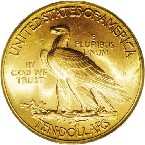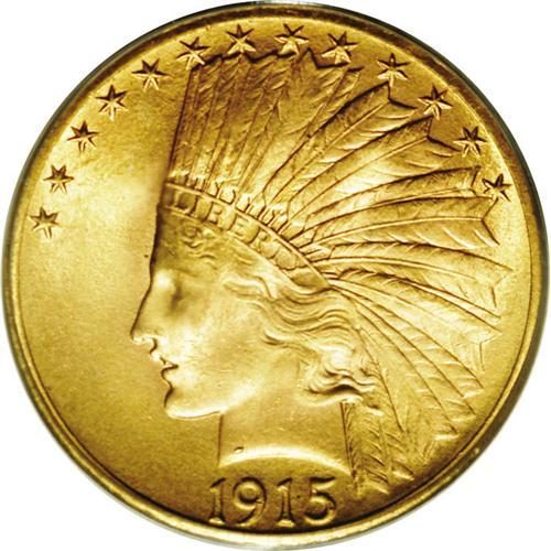<B>1915<$10> MS64 PCGS.</B></I> An exceptionally attractive coin whose lustrous, richly toned, copper-gold and sunset-orange surfaces immediately capture the attention of the viewer. Boldly struck, there are only a couple of minor abrasions on either side of this pleasing Indian eagle. A substantial die chip (as struck) resides on the edge of Liberty's bust, near the truncation. The final Philadelphia Mint issue prior to 1926, the 1915 is not rare in Mint State, but examples at the near-Gem level of preservation are both scarce and coveted.