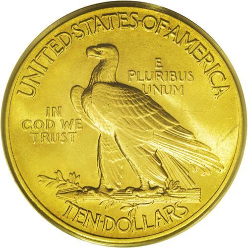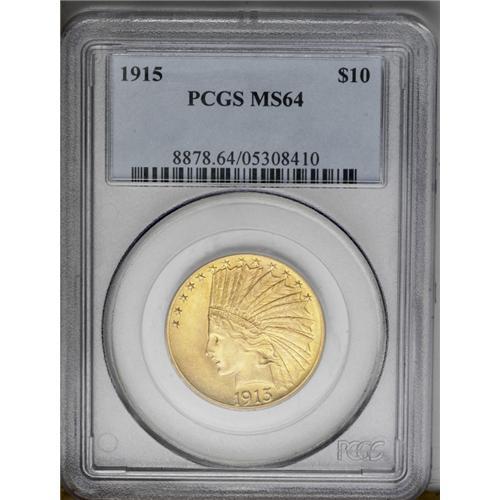 <B>1915<$10> MS64 PCGS.</B></I> This is a sharply struck example with frosty lemon-yellow luster with hints of greenish color. The surfaces are essentially mark-free, although a few tiny grade-consistent ticks are visible. A gorgeous near-Gem with wonderful eye appeal.
