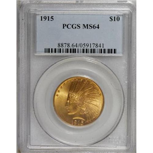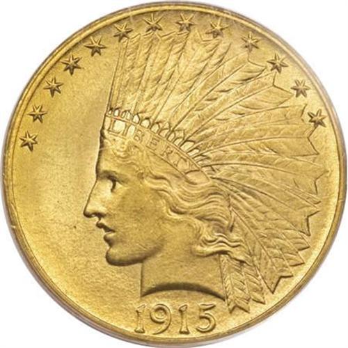 <B>1915 $10 MS64 PCGS.</B></I> A charming green-gold near-Gem that boasts a clean cheek and impressively smooth fields. The strike is precise, with only a hint of merging of detail along the left border of the front wing. The 1915 was the final Philadelphia issue prior to the 1926, and is many times scarcer than its belated successor.<BR><BR><B>Coin Engraver:</B> Augustus Saint-Gaudens<BR><BR><b>Shipping:</b> Coins & Currency (<a target="_blank" href="http://www.heritageauctions.com/common/shipping.php">view shipping information</a>)