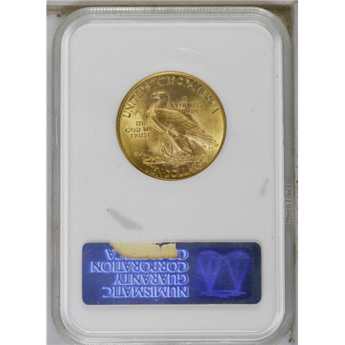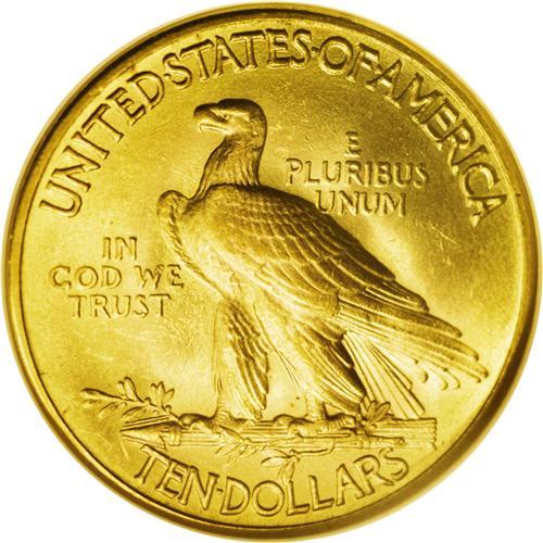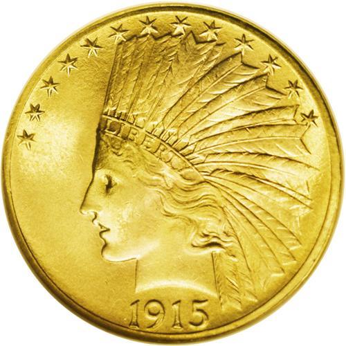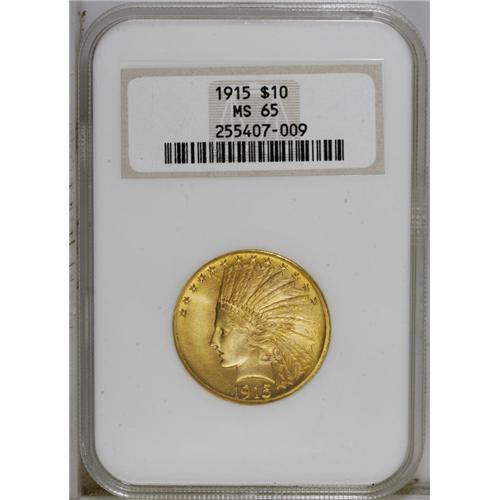 <B>1915<$10> MS65 NGC.</B></I> Booming cartwheel luster sweeps this peach and lime-tinted Gem. The portrait appears fully struck, and any incompleteness is limited to the left outline of the eagle's wing and front leg. The determined evaluator will note a few trivial grazes in the fields, but these are of little account. Encapsulated in a prior generation holder.