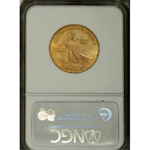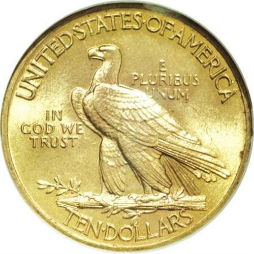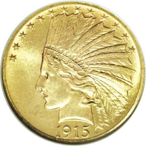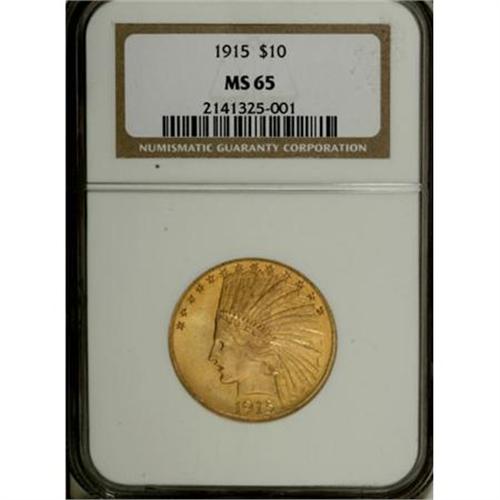 <B>1915 $10 MS65 NGC.</B></I> This beautifully lustrous specimen boasts charming greenish-gold coloration on both sides, a wonderful appearance that complements the pristine surfaces and bold strike. Even the eagle's claws on the branch are well brought up, an often-weak area of the design. A couple of tiny dark spots fail to detract at all from the stunning appearance of this high-end Gem coin. NGC has certified 21 pieces finer (1/08).<BR><BR><B>Coin Engraver:</B> Augustus Saint-Gaudens<BR><BR><b>Shipping:</b> Coins & Currency (<a target="_blank" href="http://www.heritageauctions.com/common/shipping.php">view shipping information</a>)