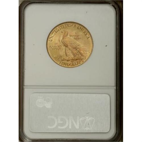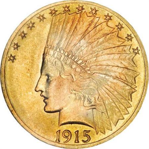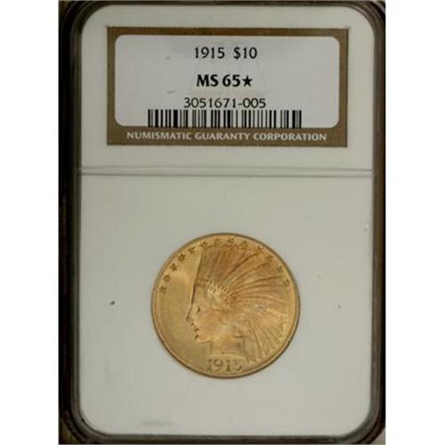 <B>1915 $10 MS65 <img src="/images/star.gif" width="10" height="10" alt="" border="0"> NGC.</B></I> Peach splashes adorn the devices, and the fields are olive-gold. The colorful toning is undoubtedly the inspiration for NGC's <img src="/images/star.gif" width="10" height="10" alt="" border="0"> designation. A well struck Gem with smooth fields and only inconsequential contact on the face and neck. As of (11/07), NGC has awarded a <img src="/images/star.gif" width="10" height="10" alt="" border="0"> to only two 1915 eagles, both at the MS65 level.<BR><BR><B>Coin Engraver:</B> Augustus Saint-Gaudens<BR><BR><b>Shipping:</b> Coins & Currency (<a target="_blank" href="http://www.heritageauctions.com/common/shipping.php">view shipping information</a>)